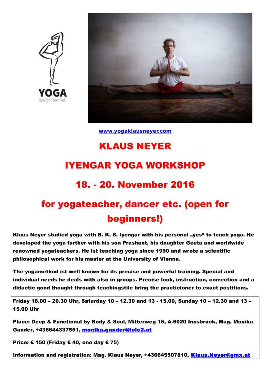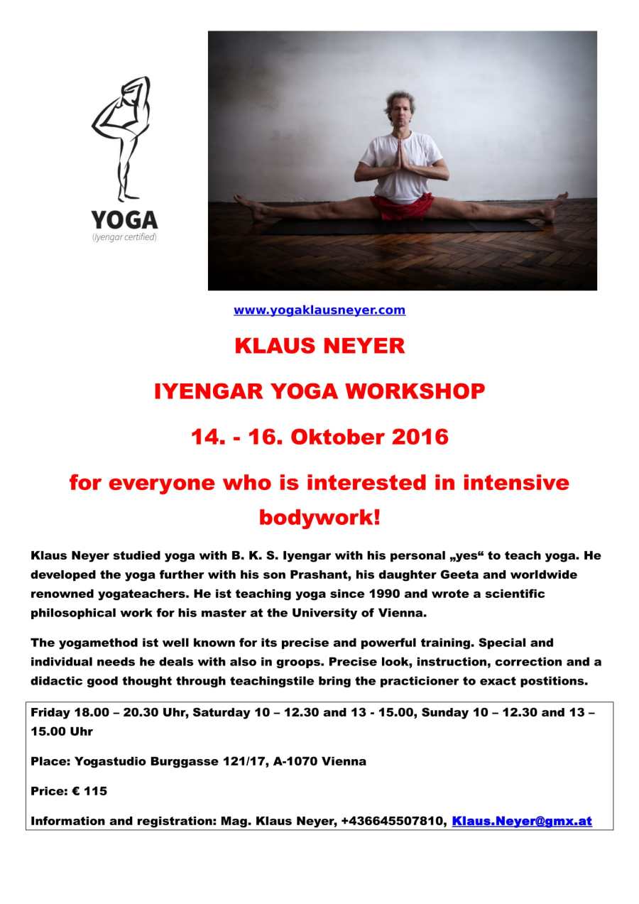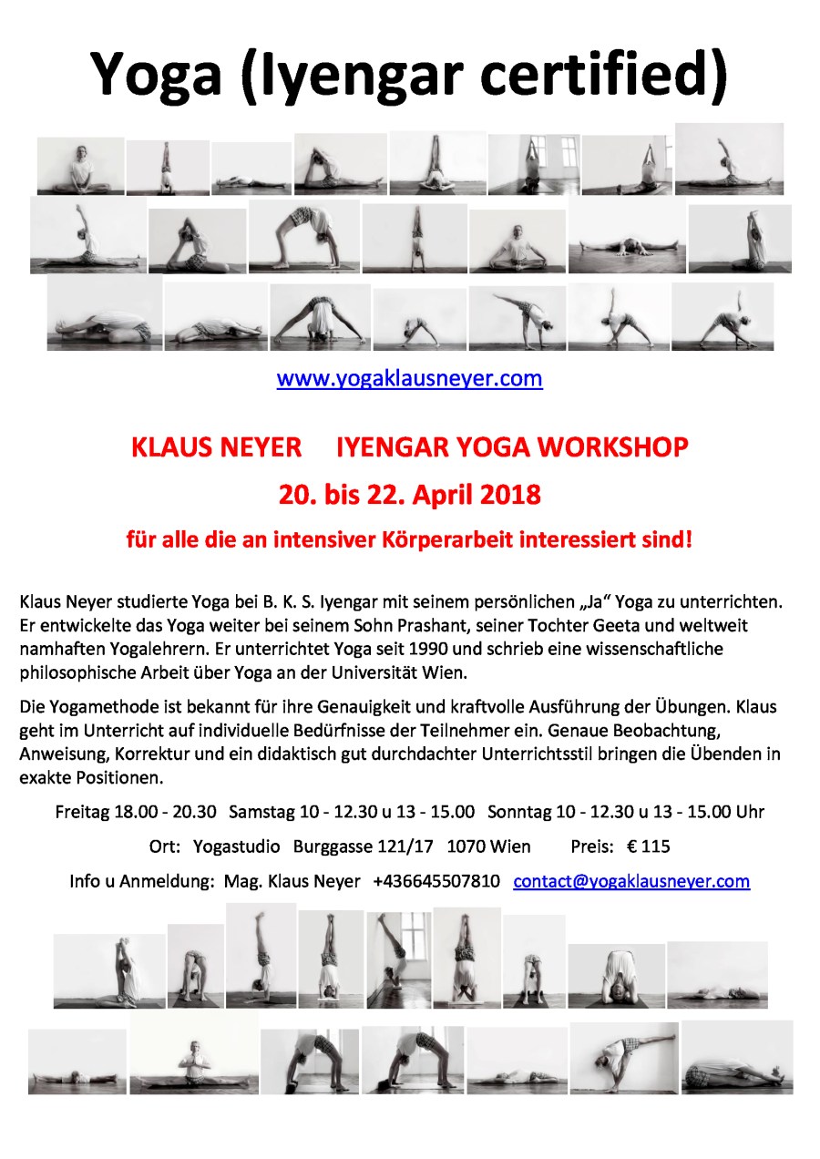Der Workshop bietet praktisch einen Querschnitt durch das Iyengar-Yoga wie in Light on Yoga von B. K. S. Iyengar dargestellt. Wir werden an den Übungen arbeiten so weit wir kommen. Stehübungen, Vorbeugen, Rückbeugen, Sitzübungen, Destination Padmasana, Umkehrstellungen wie Kopfstand, Schulterstand etc.