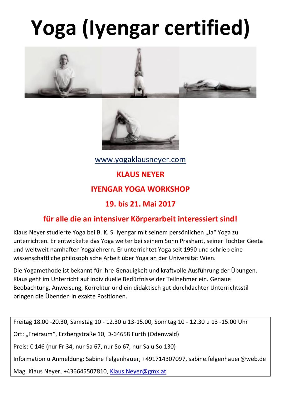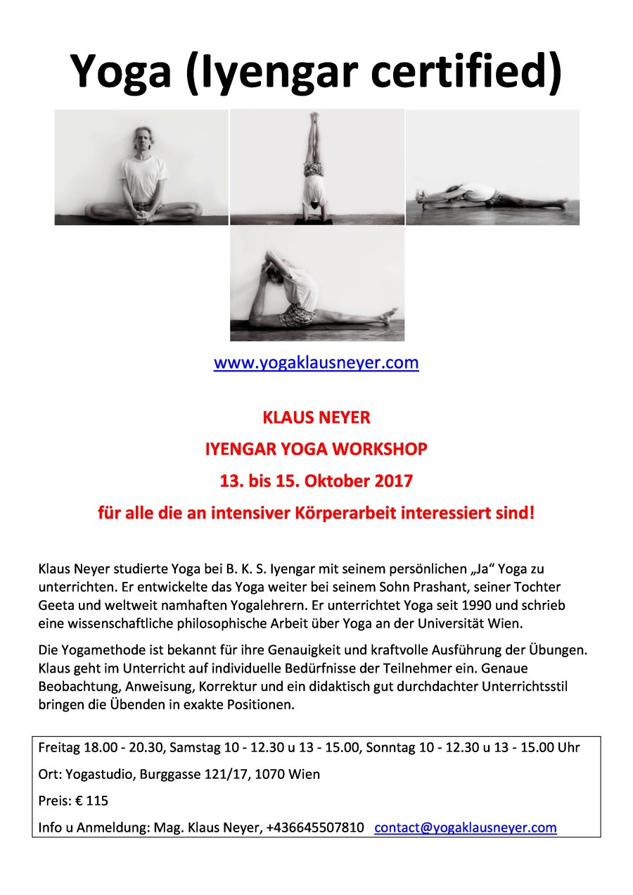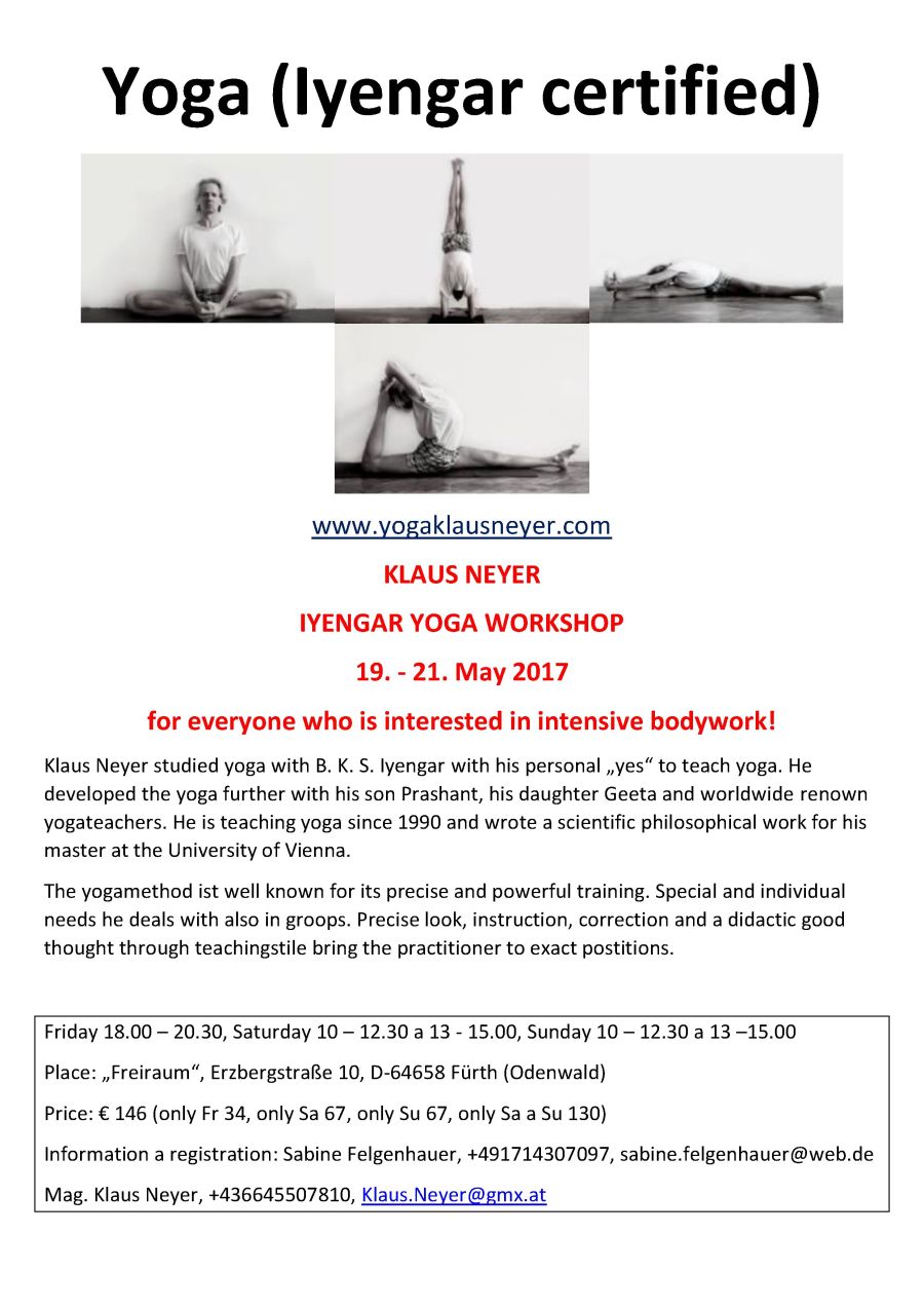 Der Workshop bietet praktisch einen Querschnitt durch das Iyengar-Yoga wie in Light on Yoga von B. K. S. Iyengar dargestellt. Wir werden an den Übungen arbeiten so weit wir kommen. Stehübungen, Vorbeugen, Rückbeugen, Sitzübungen, Destination Padmasana, Umkehrstellungen wie Kopfstand, Schulterstand etc.