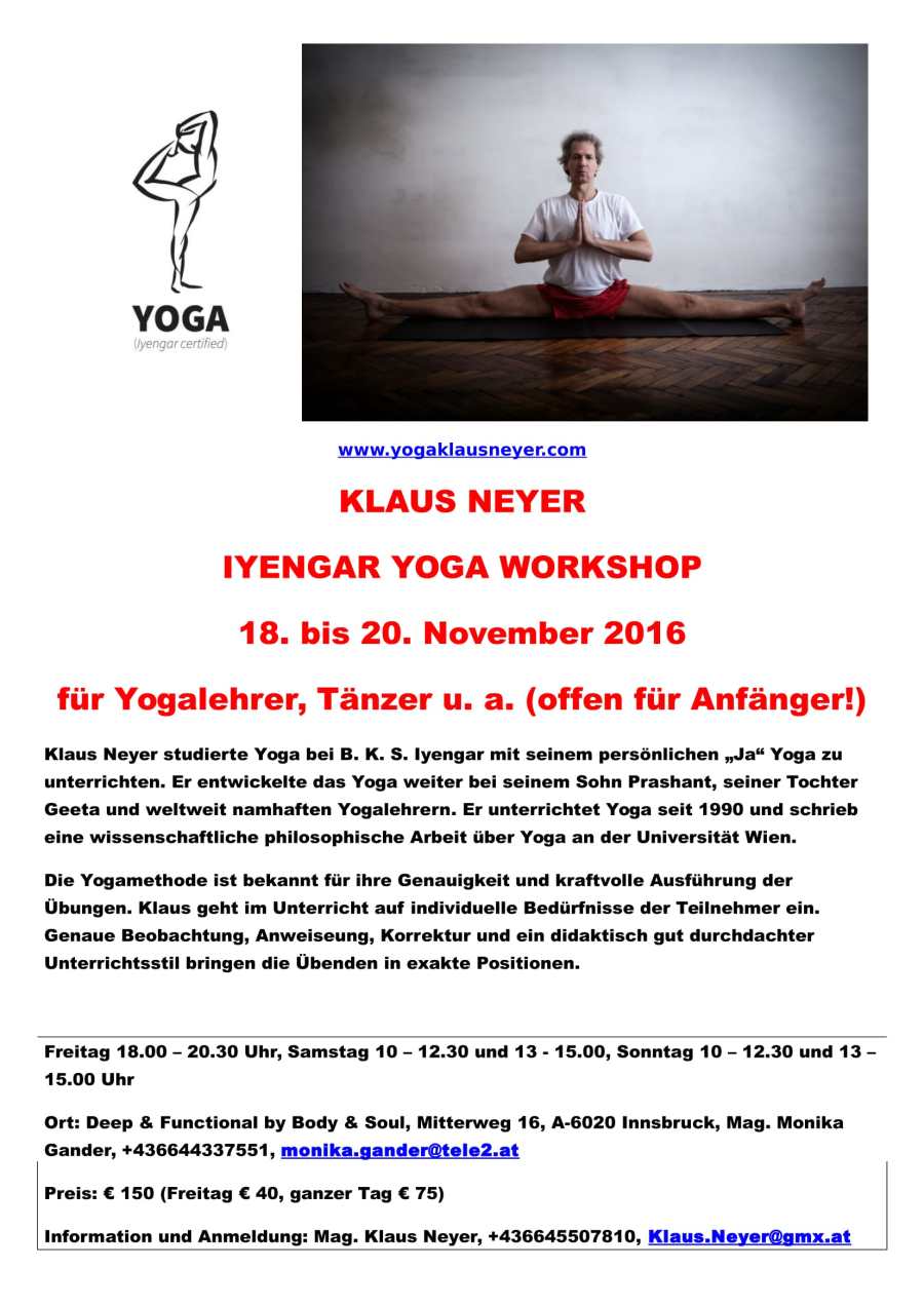 Klaus Neyer studierte Yoga bei B. K. S. Iyengar mit seinem persönlichen „Ja“ Yoga zu unterrichten. Er entwickelte das Yoga weiter bei seinem Sohn Prashant, seiner Tochter Geeta und weltweit namhaften Yogalehrern. Er unterrichtet Yoga seit 1990 und schrieb eine wissenschaftliche philosophische Arbeit über Yoga an der Universität Wien. Er führt ein Yogastudio in 1070 Wien wo er die Yogalehrerausbildung Yoga: The Iyengar Way 200h (+ 300h advanced) leitet und unterrichtet Workshops über ganz Europa.
