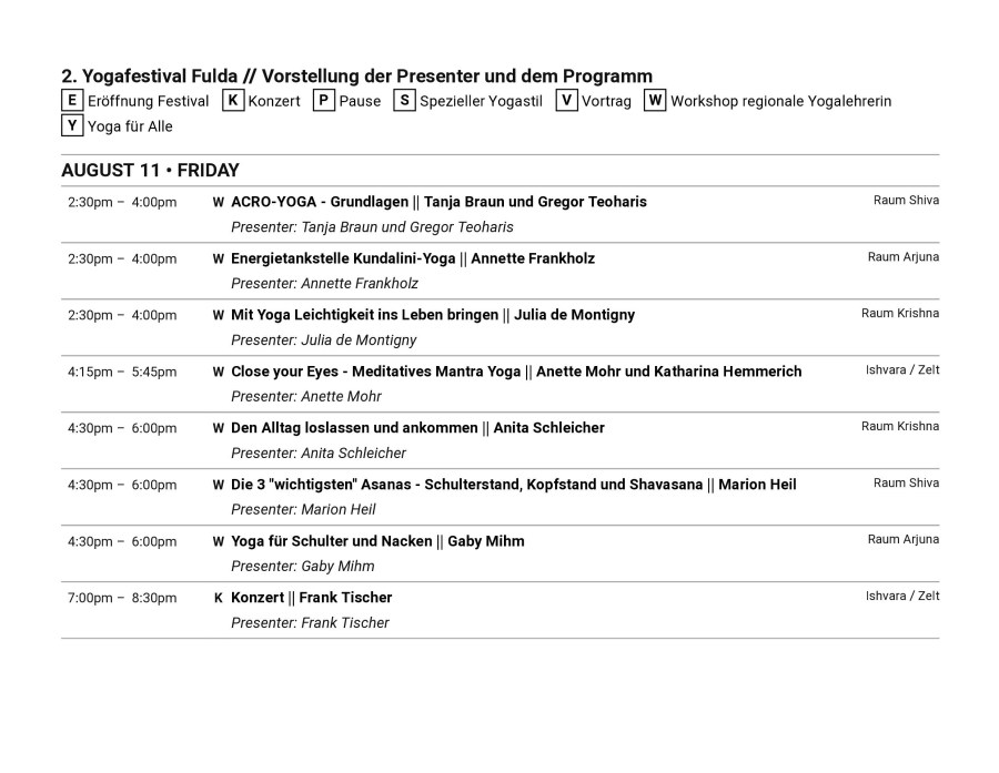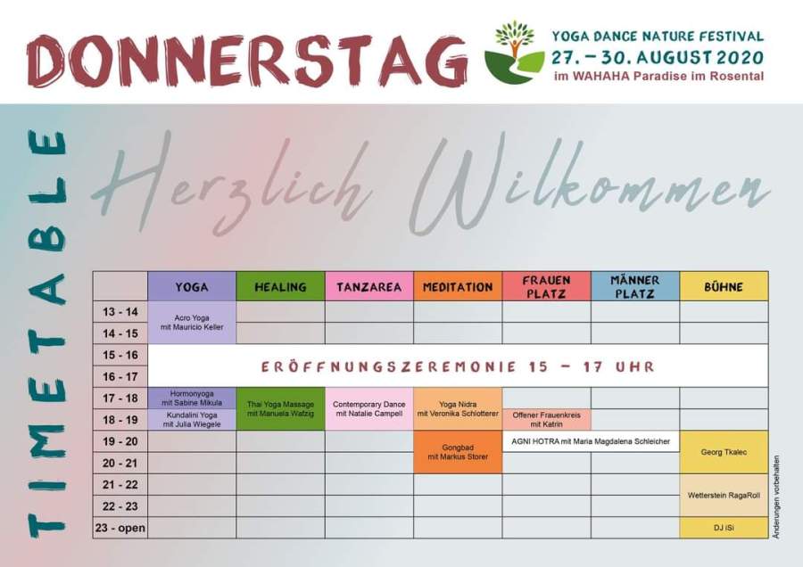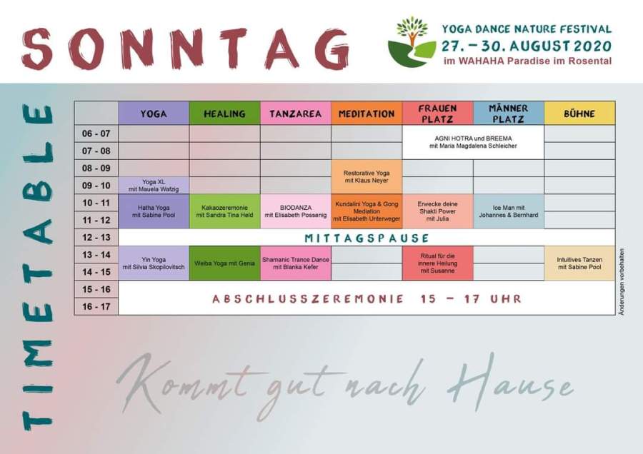 Sonntag 16.00 Anreise • 17-17.30 Willkommen • 18-19.30 Yoga • 19.30-20.30 Abendessen