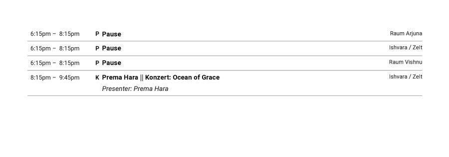 Montag – Samstag 9-10.00 Frühstück • 10-12.00 Yoga • 12-13.00 Mittagessen • 13-15.00 Yoga • 17.30-18.00 Philosophie • 18-19.00 Pranayama • 19-20.00 Abendessen
